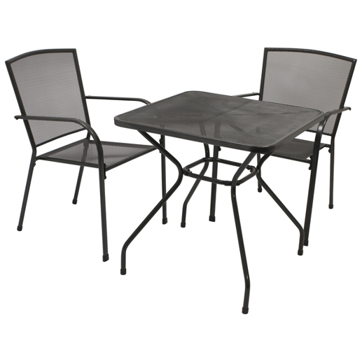 Gefertigt aus robustem Streckmetall und in einem ansprechenden anthraziten Farbton, ist die Garnitur sowohl langlebig als auch pflegeleicht. Die Sessel bieten perfekt dimensionierte Maße von 55,5x57x87 cm, während der Tisch mit 70x70x72 cm genügend Platz für Ihre Besuche bereitstellt.