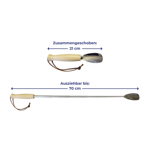 Der ergonomisch geformte Griff aus robustem Kautschukbaumholz bietet eine angenehme Haptik, während der Schuhlöffel und der Teleskopstiel aus rostfreiem Edelstahl gefertigt sind, um eine lange Lebensdauer und hohe Stabilität zu gewährleisten. Wenn er nicht in Gebrauch ist, lässt sich der Schuhanzieher auf handliche 21,5 cm zusammenschieben, sodass er problemlos in jede Schublade oder jedes Gepäck passt. Dank der praktischen Lederschlaufe ist der Schuhanzieher zudem stets griffbereit und optimal verstaut.